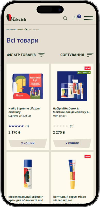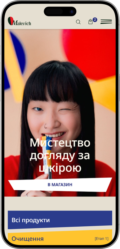 Главная страница проэкта MALEVICH создана как визуально привлекательный и интуитивно понятный стартовый экран для пользователей, где сочетаются эстетика бренда и функциональность e-commerce. Она сразу знакомит посетителя с продукцией и ценностями бренда через большой центральный слайд с ключевым сообщением и анимационными акцентами, усиливающими эмоциональное восприятие. Пользователь может быстро перейти к каталогу продукции или популярным категориям, а интерактивные элементы обеспечивают плавную навигацию и удобный доступ к страницам товаров. Дополнительные блоки, такие как преимущества бренда, акции и новинки, представлены в структурированном формате, подчеркивающем профессионализм и современность сайта. Важной составляющей является оптимизированное взаимодействие с пользователем: анимации органично сопровождают основные действия — от просмотра каталога до перехода на страницу конкретного продукта, обеспечивая лёгкий и приятный пользовательский опыт без потери производительности.