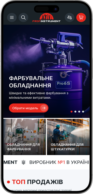 Главная страница Profinstrument спроектирована как эффективный коммерческий инструмент, который с первых секунд четко транслирует специализацию магазина — продажу профессионального инструмента и оборудования — и направляет пользователя к взаимодействию с ассортиментом.