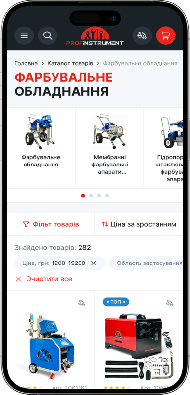Каталог товаров Profinstrument разработан для эффективной работы с большим ассортиментом профессионального оборудования и инструмента, обеспечивая быстрый поиск и удобный выбор продукции. Основной акцент сделан на сокращение времени до нахождения нужного товара и повышение вероятности покупки.