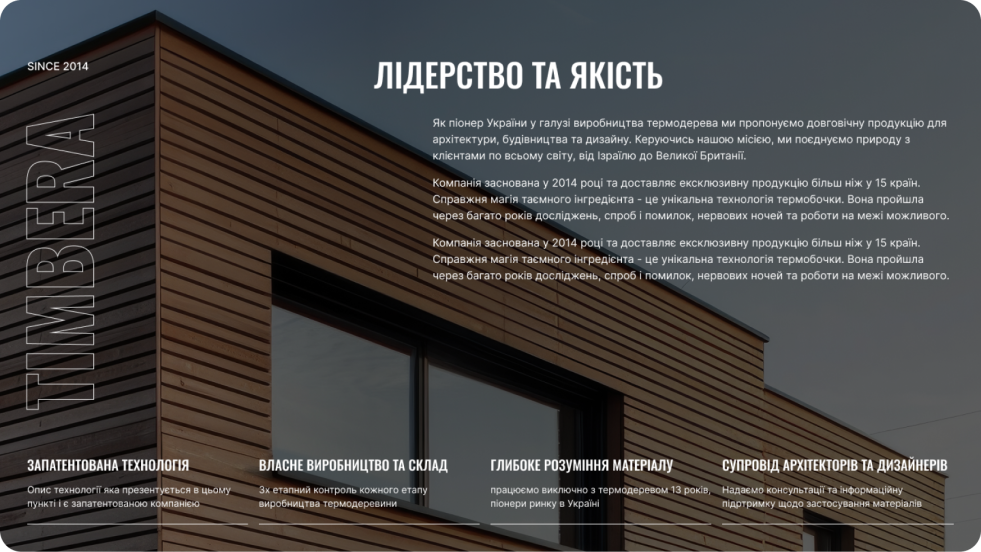 Первый экран главной страницы Timbera Group выполняет роль ключевой точки входа в бренд и сразу формирует корректное позиционирование компании. Он фокусируется на демонстрации продукта — термодревесины — как премиального, экологичного и технологичного материала для современных архитектурных и дизайнерских решений. Крупный визуальный акцент, минималистичный дизайн и чёткое сообщение позволяют пользователю с первых секунд понять специализацию компании и область её экспертизы. Первый экран работает на эмоциональное вовлечение, усиливает ощущение качества и надёжности бренда, а также мотивирует к дальнейшему знакомству с продуктами и возможностями Timbera Group.