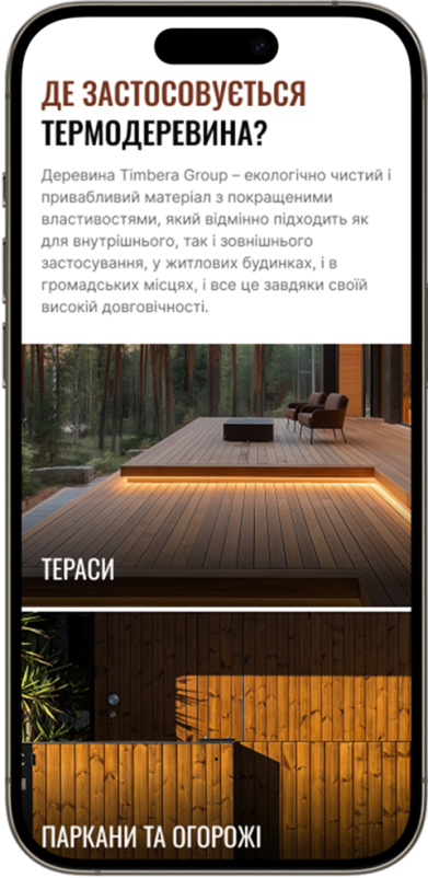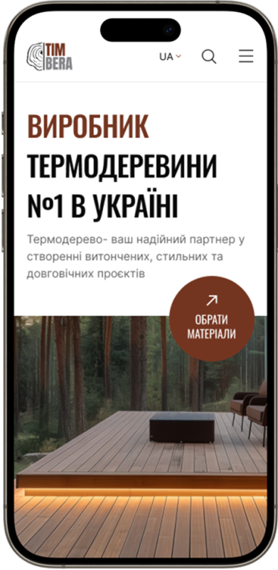 Задание Проект Timbera Group имел целью создать современный, понятный и коммерчески эффективный сайт для презентации и продажи термодревесины (термолиса) — экологического и высококачественного материала, используемого в фасадах, террасах, интерьерах и других архитектурных решениях.
