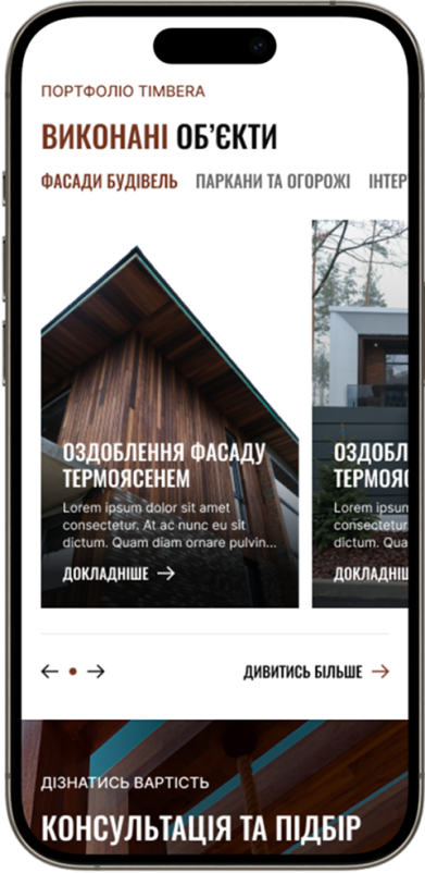 Главная страница направлена на формирование доверия и укрепление экспертного статуса Timbera Group на рынке термодревесины. Акцент сделан на опыте компании, высоких стандартах производства и контроле качества на каждом этапе — от обработки сырья до готового продукта. Главная страница работает как важный элемент B2B-коммуникации, усиливает доверие со стороны архитекторов, дизайнеров и девелоперов и помогает пользователю уверенно перейти к выбору продукции или запросу коммерческого предложения.