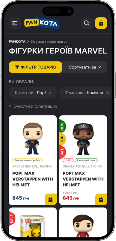 Розроблено стильові банери та зручну багаторівневу навігацію по каталогу та асортименту загалом. Враховуючи різноплановість тематики сайту та величезну різноманітність способів пошуку, командою було створено інтерактивний підхід до позиціонування звичної продукції, але в незвичний спосіб. Кожен новий блок на сторінці дозволяє поглянути на пошук і підбір тематики, всесвіту та персонажів фігурки з нового боку. Такий прийом використаний не випадково, а побудований на основі експертизи ніші, проведеної командою проєкту.